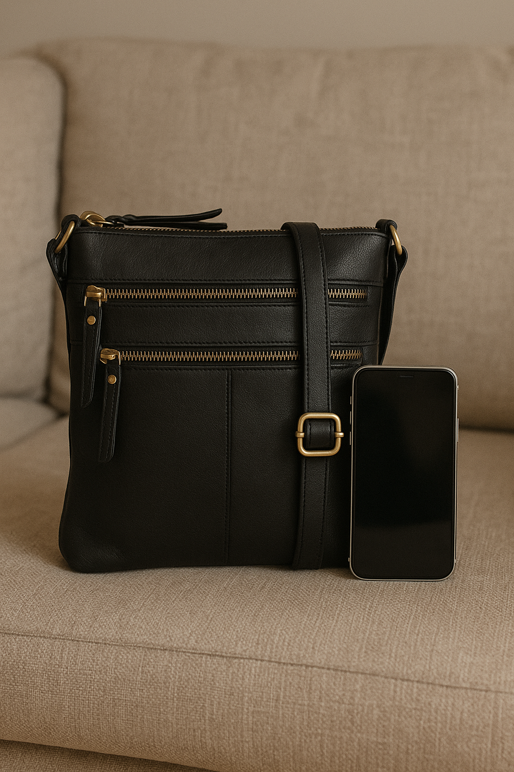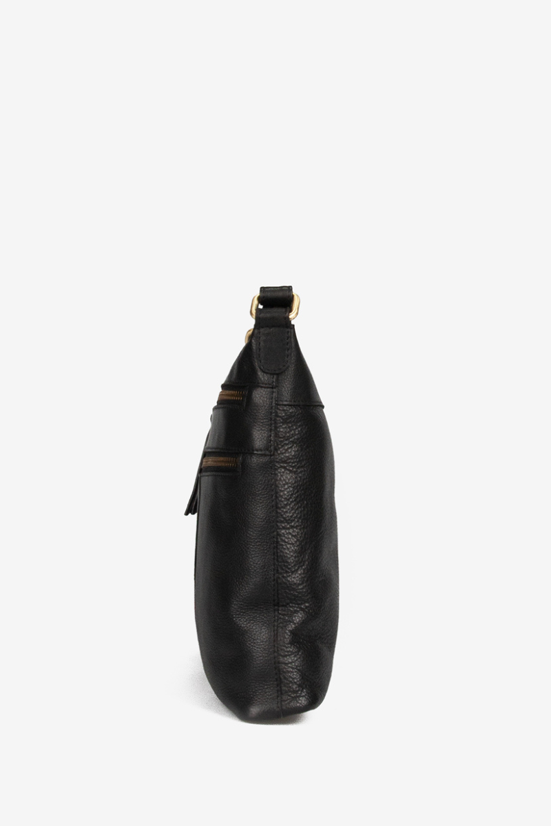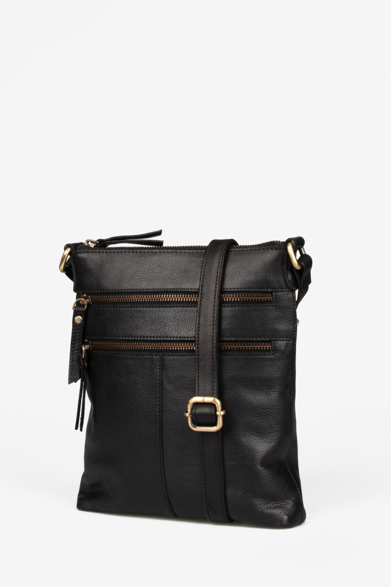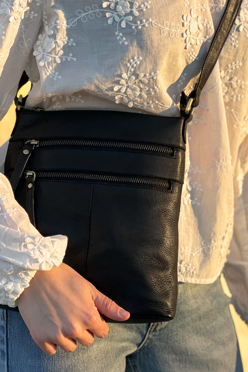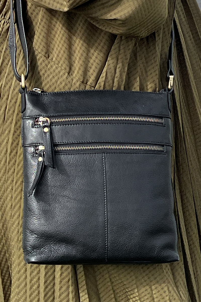 Rankinė pagaminta iš aukštos kokybės natūralios odos Indijoje, todėl yra patvari ir elegantiška. Rankinės viršus užsegamas užtrauktuku, o priekyje yra dvi patogios papildomos kišenės su užtrauktukais, kad būtų galima greitai pasiekti būtiniausius daiktus.
