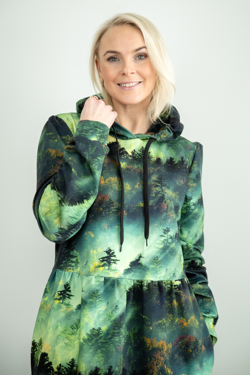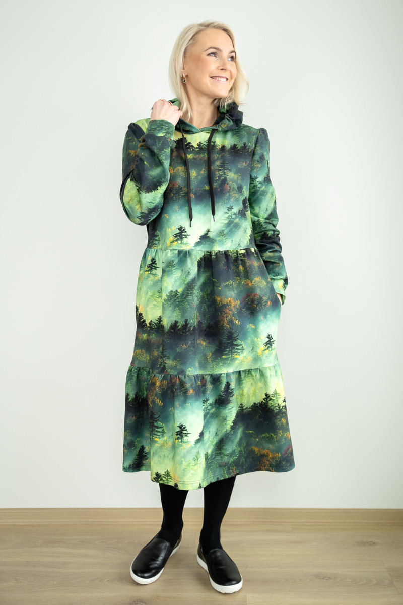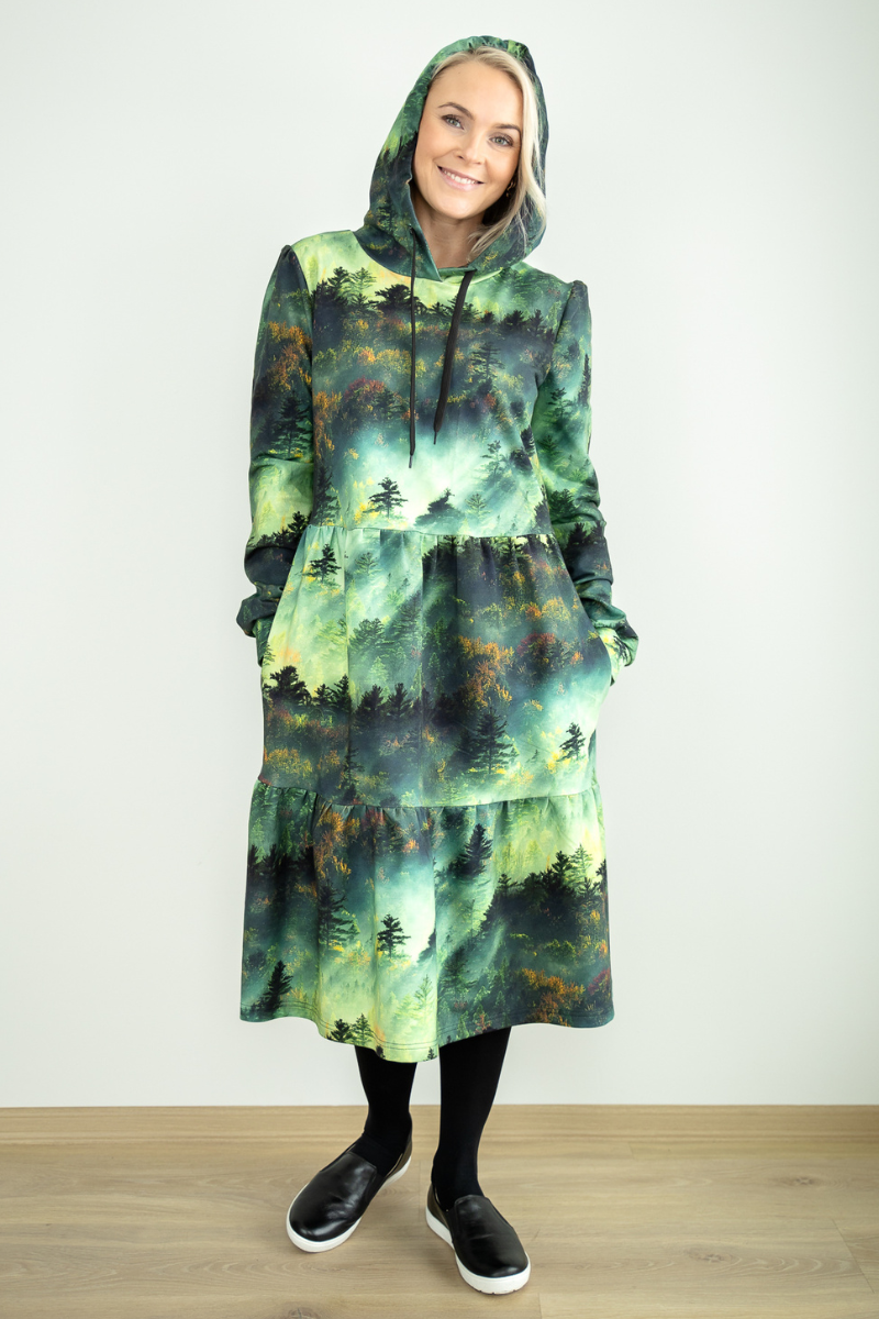 Avara lõikega pikem figuurisõbralik taskute ja kapuutsiga kleit Helen Rabamets-Kohe laos suurus XL
