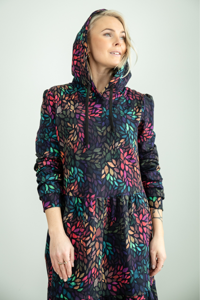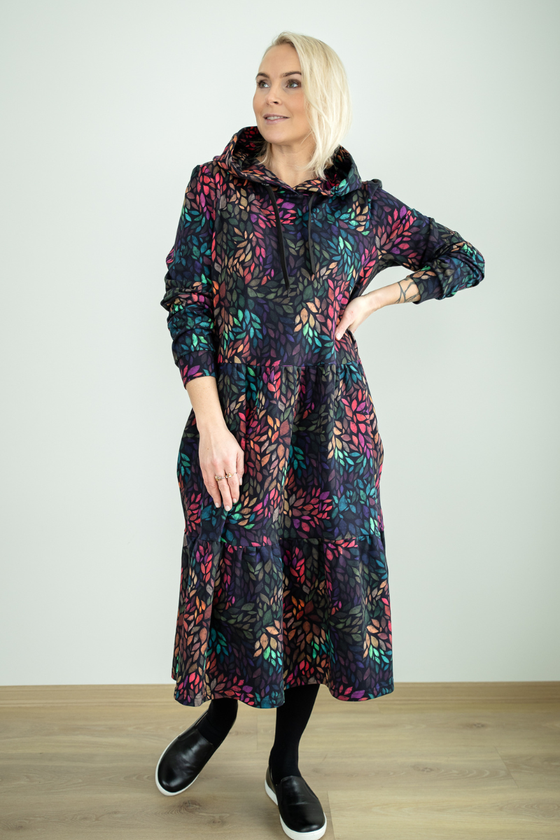 Avara lõikega pikem figuurisõbralik taskute ja kapuutsiga kleit Helen Värvide Mäng-Kohe laos XL-viimased jäänud