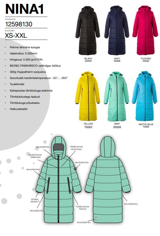 Soojustus: 300 g vatiin – soovituslik mantli kandmise temperatuur -5°C kuni -30 °C