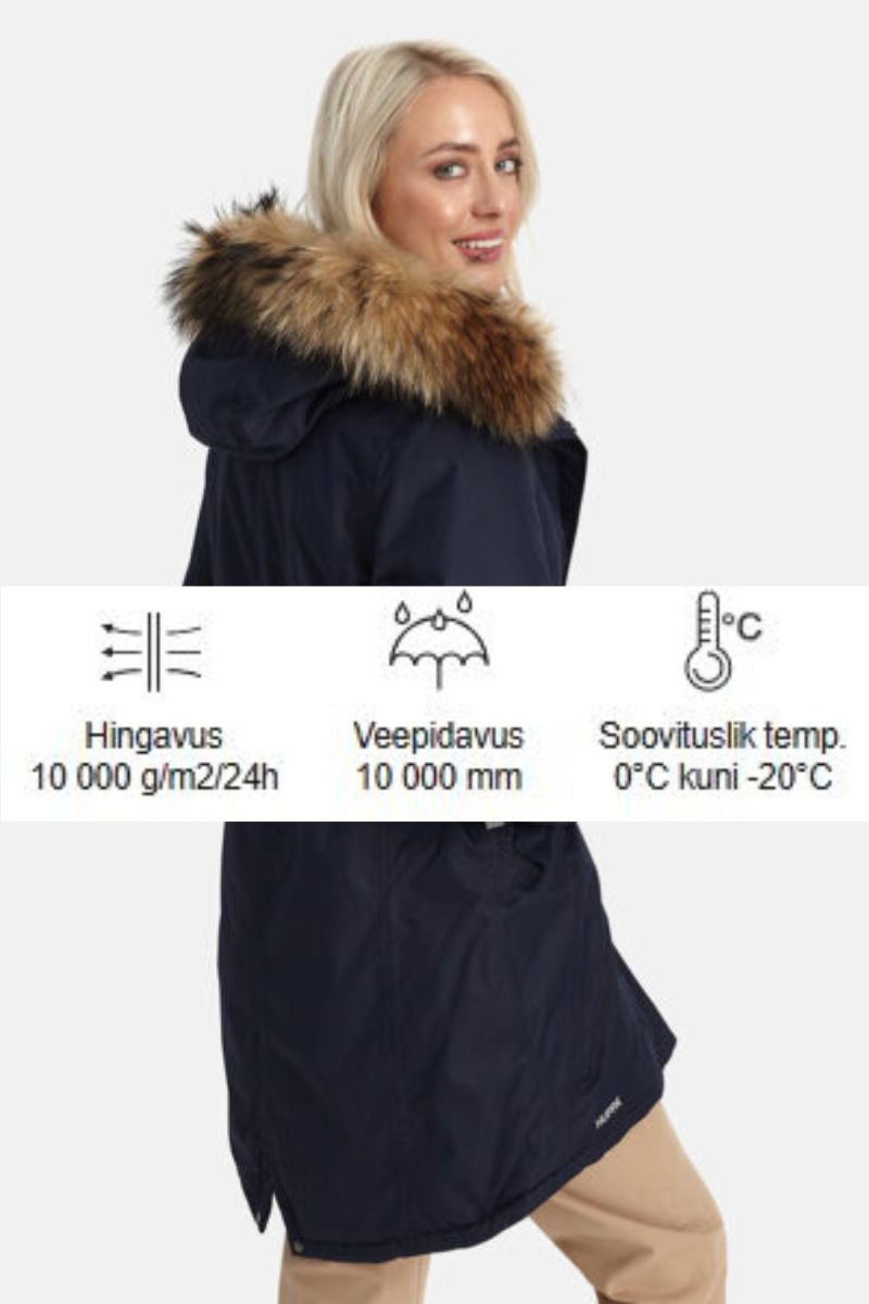 Tänu 200 g soojustusele ja karvasele selja ja kapuutsi sisevoodrile sobib see parka ideaalselt