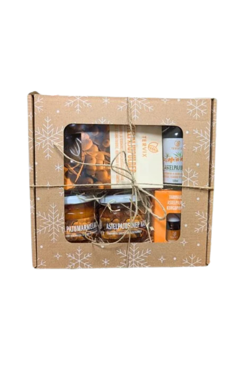 See suur ja luksuslik kinkekomplekt sisaldab Tervixi käsitööna valminud ja Eestis toodetud astelpaju ja tervisetooteid, mis pakuvad nii sisemist kui ka välist heaolu: