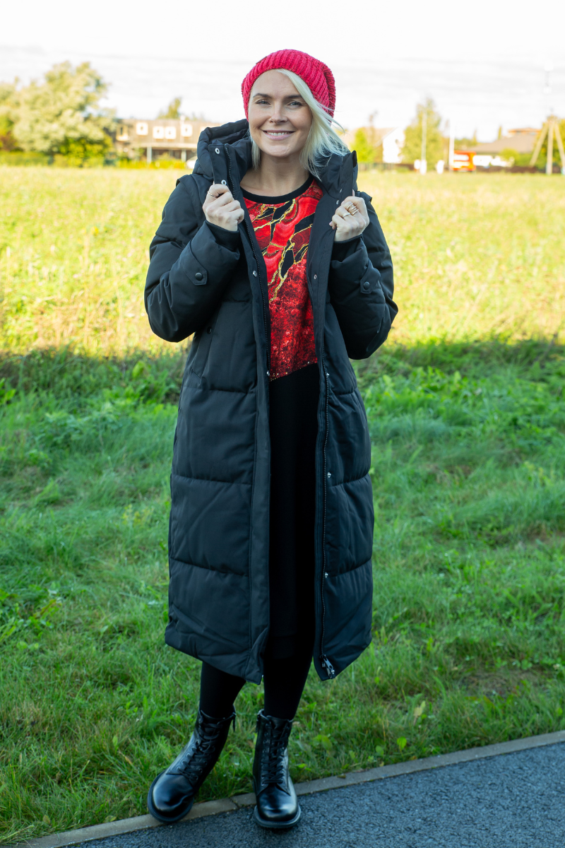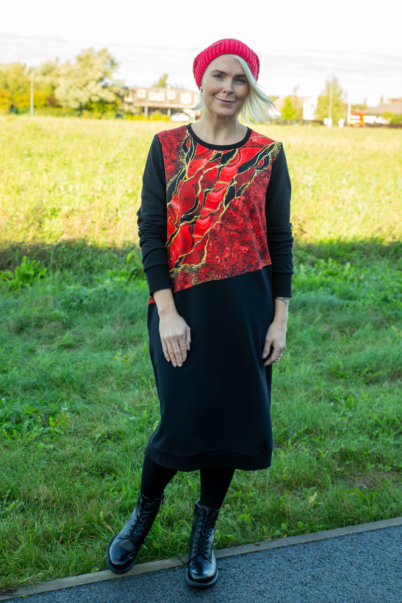 Kleidis tunned ennast hästi, sest kleidi materjal on parajalt soe, kleit on hea pikema pikkusega(enamus naistel jääb põlv kleidi sisse) ja kleiti saab Eestis kanda kõigil neljal aastaajal.Külmemal ajal lisa alla vaid soojad sukkpüksid.
