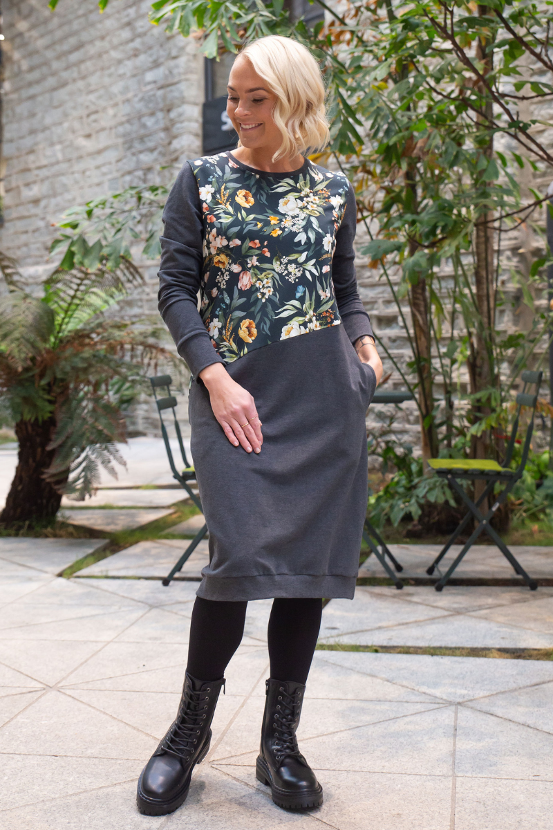 Stiilne tumehall taskutega pusakleit Aasalilled-Suurus S kohe laos-teised suurused tellimisel