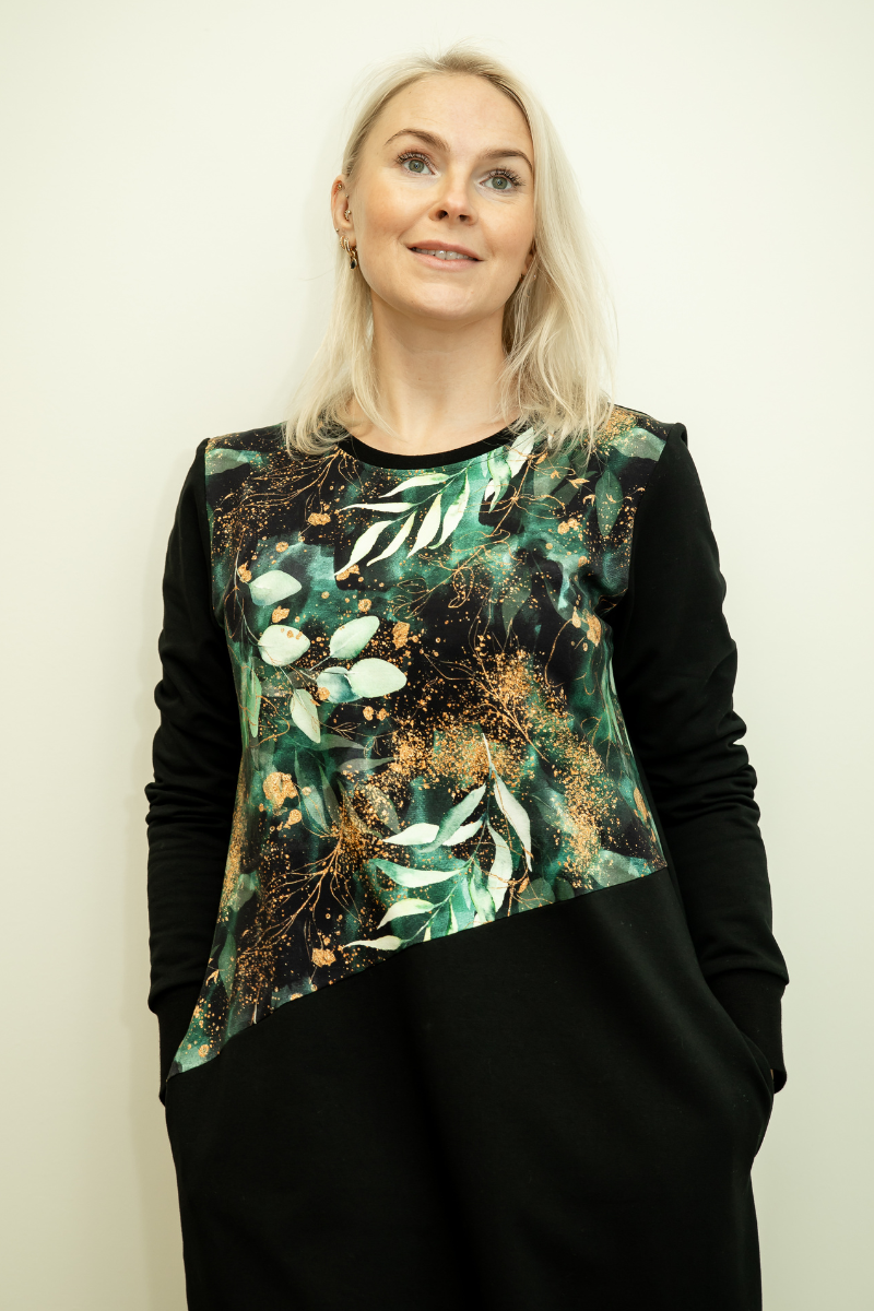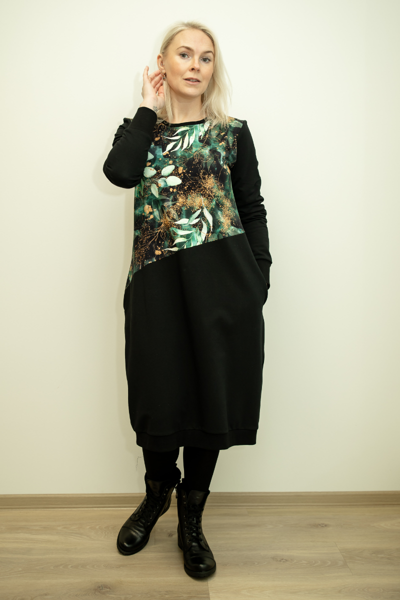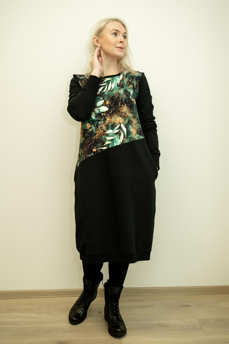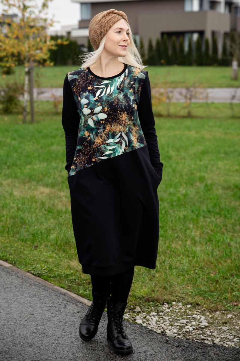 Armas rohelise lehe mustriga kõrge piha osaga pikem figuurisõbralik taskutega kleit Nelli- Kohe laos M, L ja XL