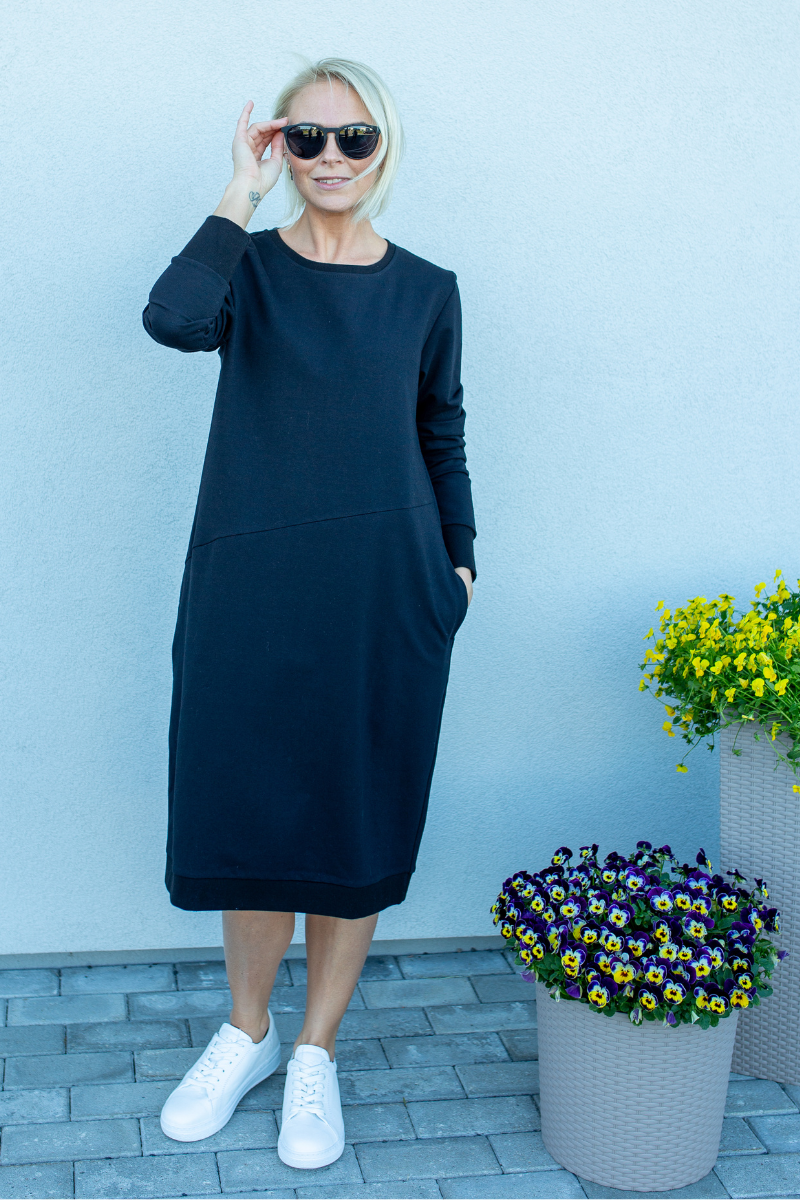 Stilinga juoda moteriška megztinė suknelė su kišenėmis Raidės Plunksnos – pagal pageidavimą