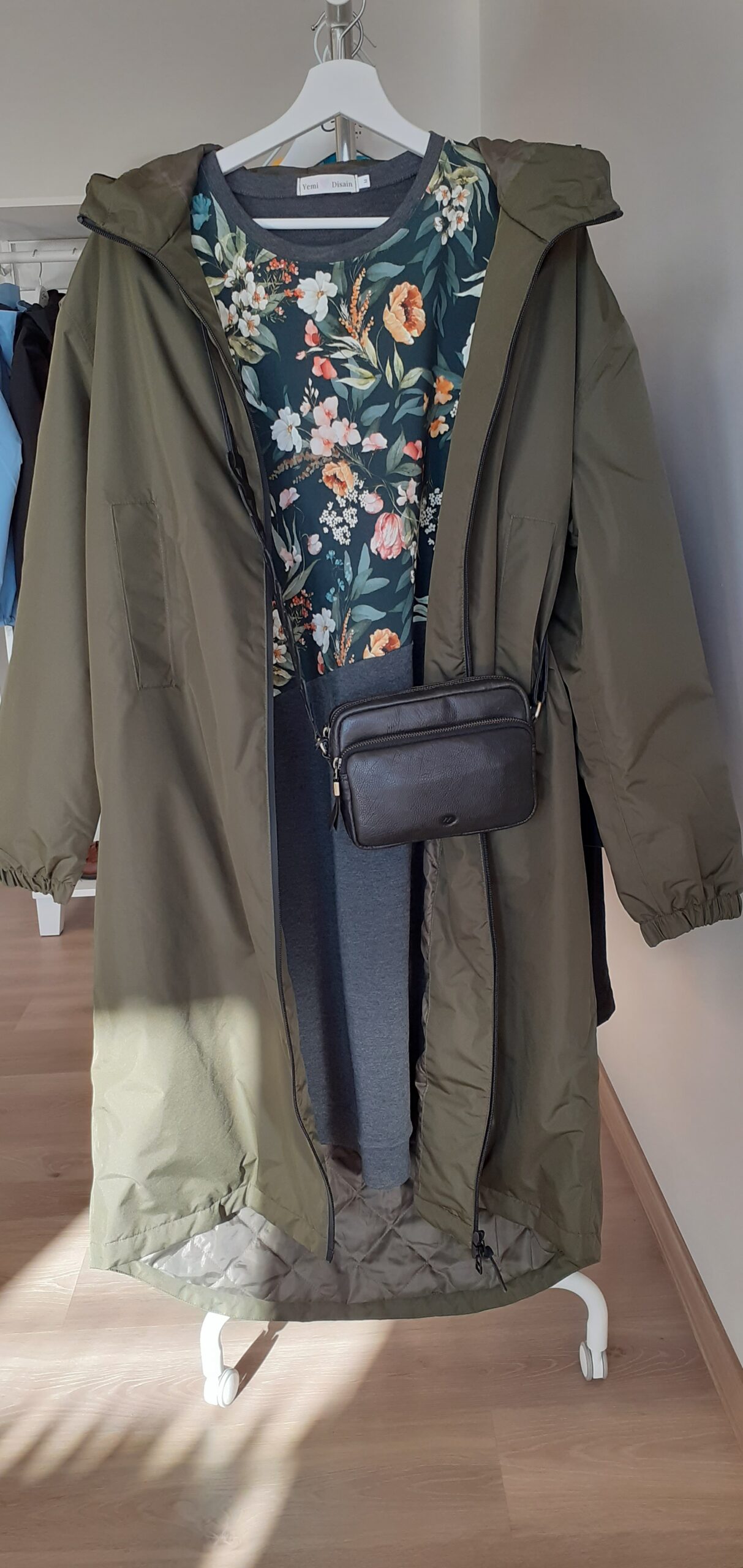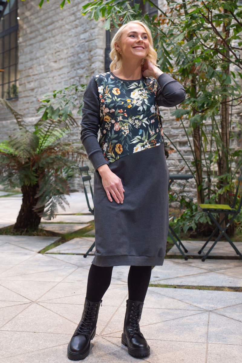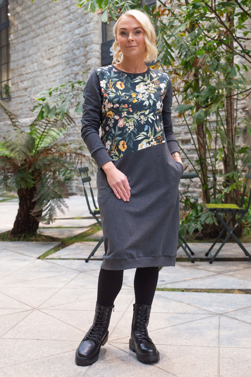 Stiilne tumehall taskutega pusakleit Aasalilled-Suurus S kohe laos-teised suurused tellimisel